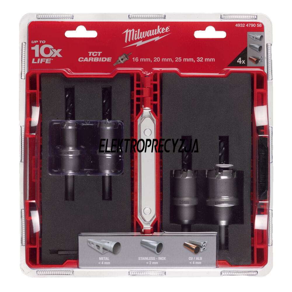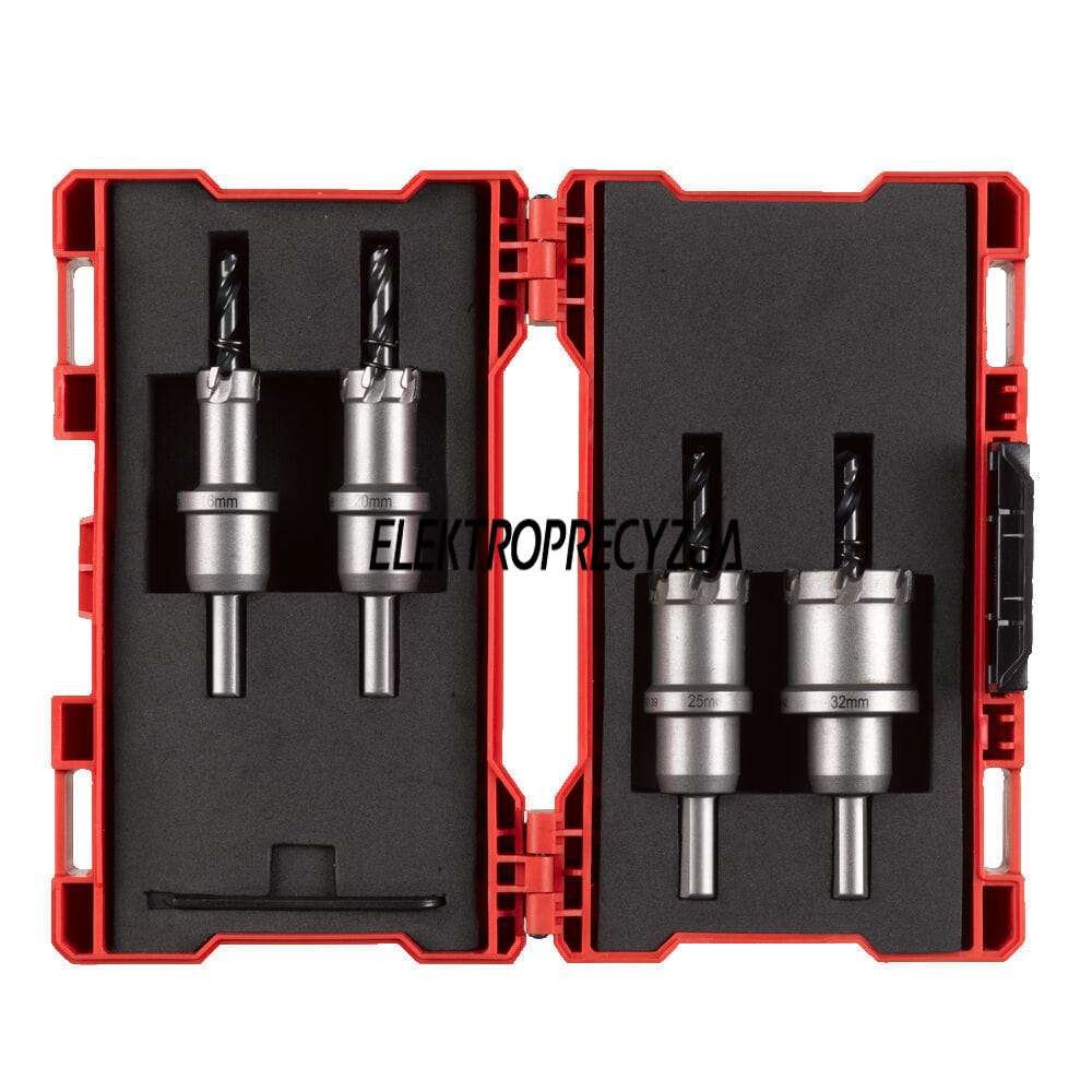 Zawiera: Zestaw otwornic z węglika TCT: ⌀ 16, 20, 25, 32 mm. Klucz imbusowy⅛″